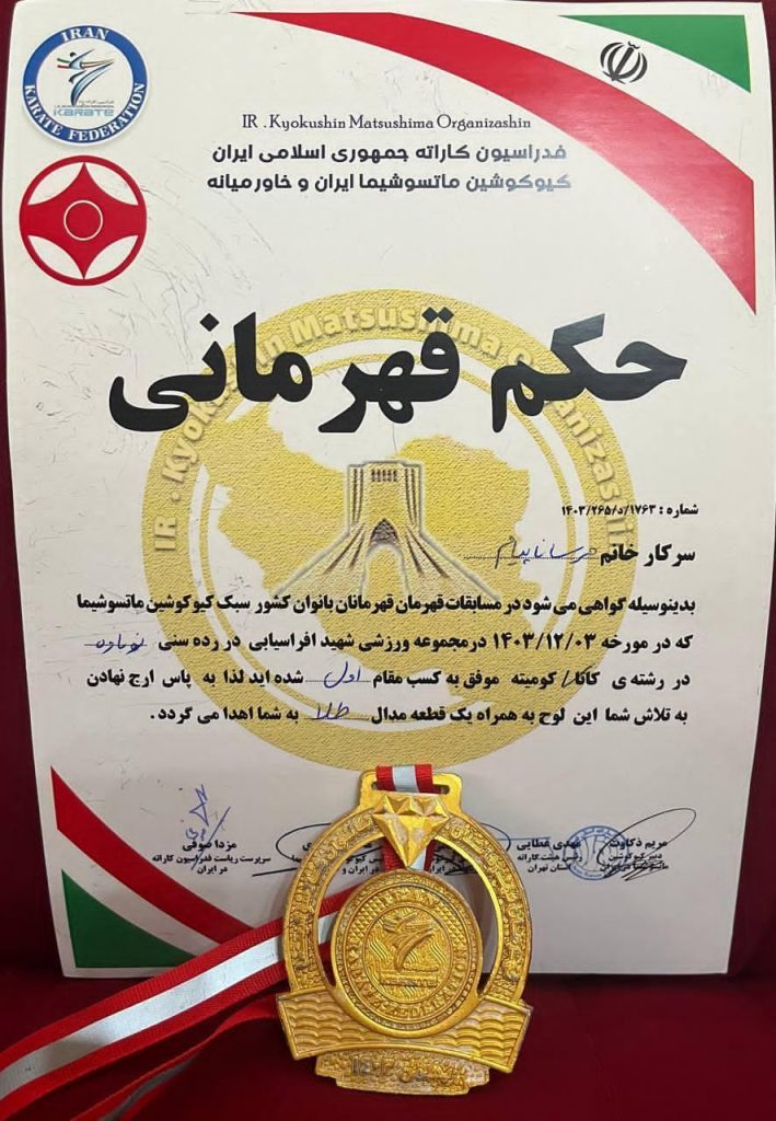 مرساناپیام به مربی گری شیهان مریم کاشانی موفق به کسب مقام اول ومدال طلای مسابقات قهرمان قهرمانان بانوان کشورسبک کیوکوشین ماتسوشیما شد.